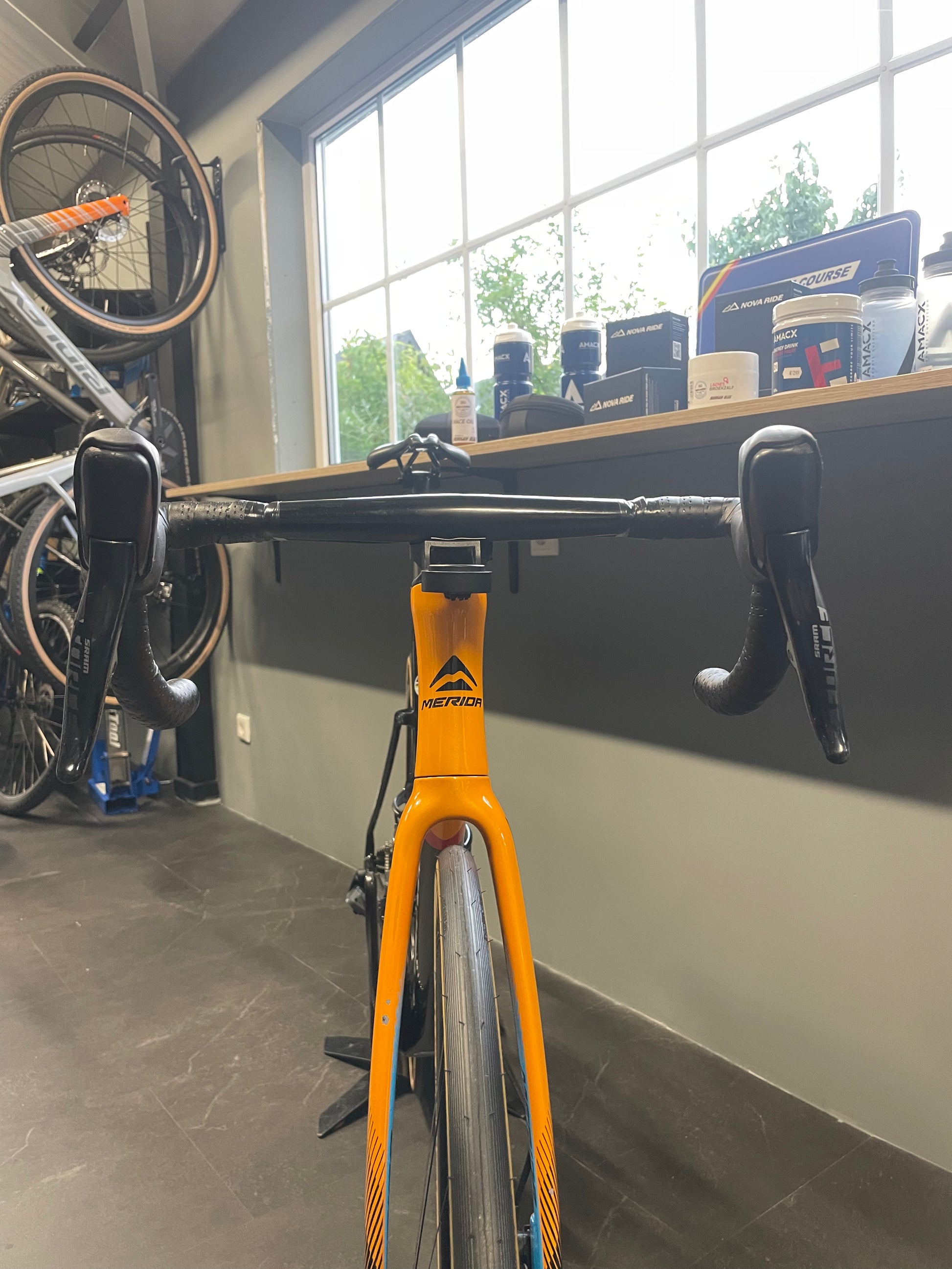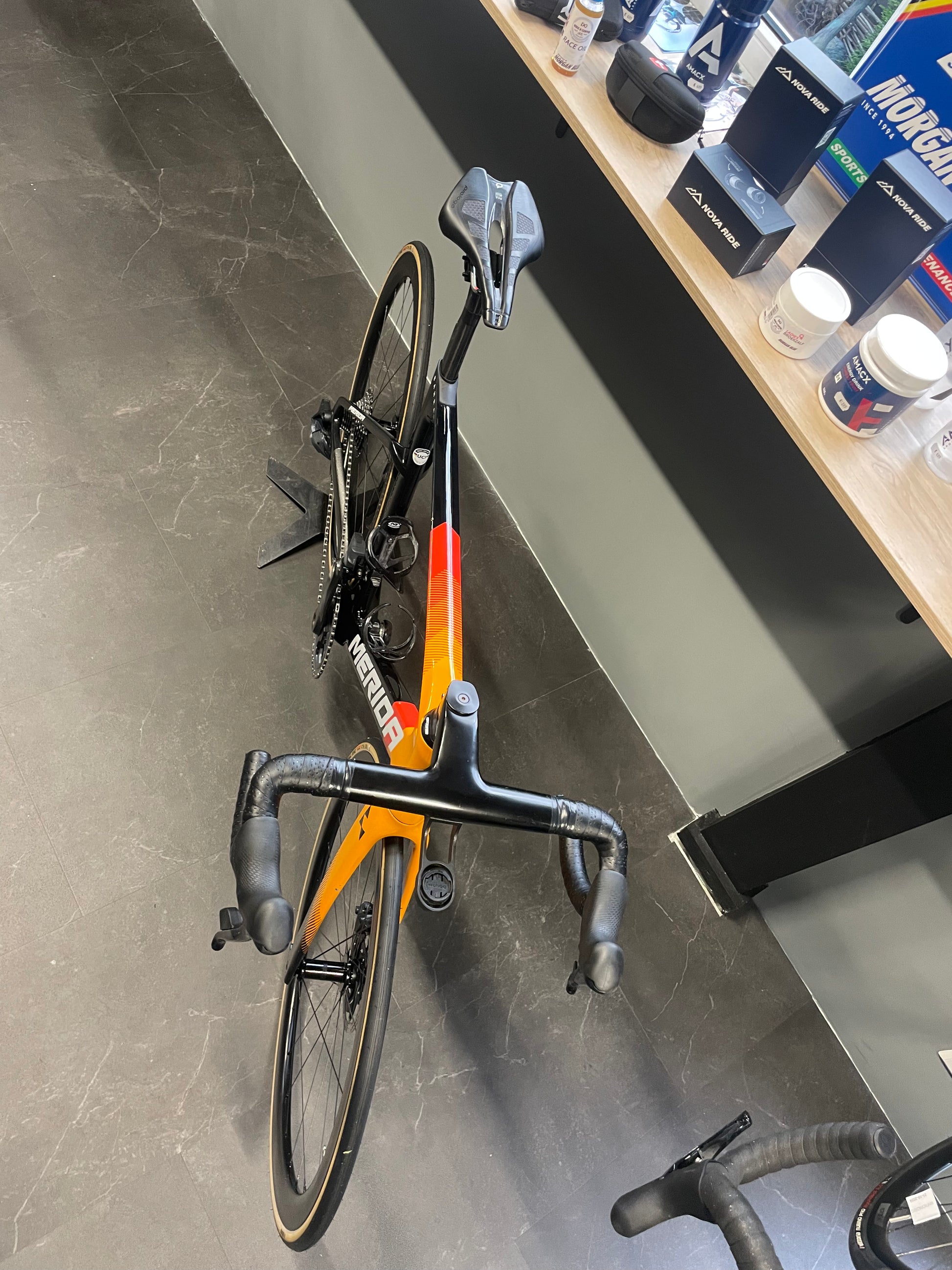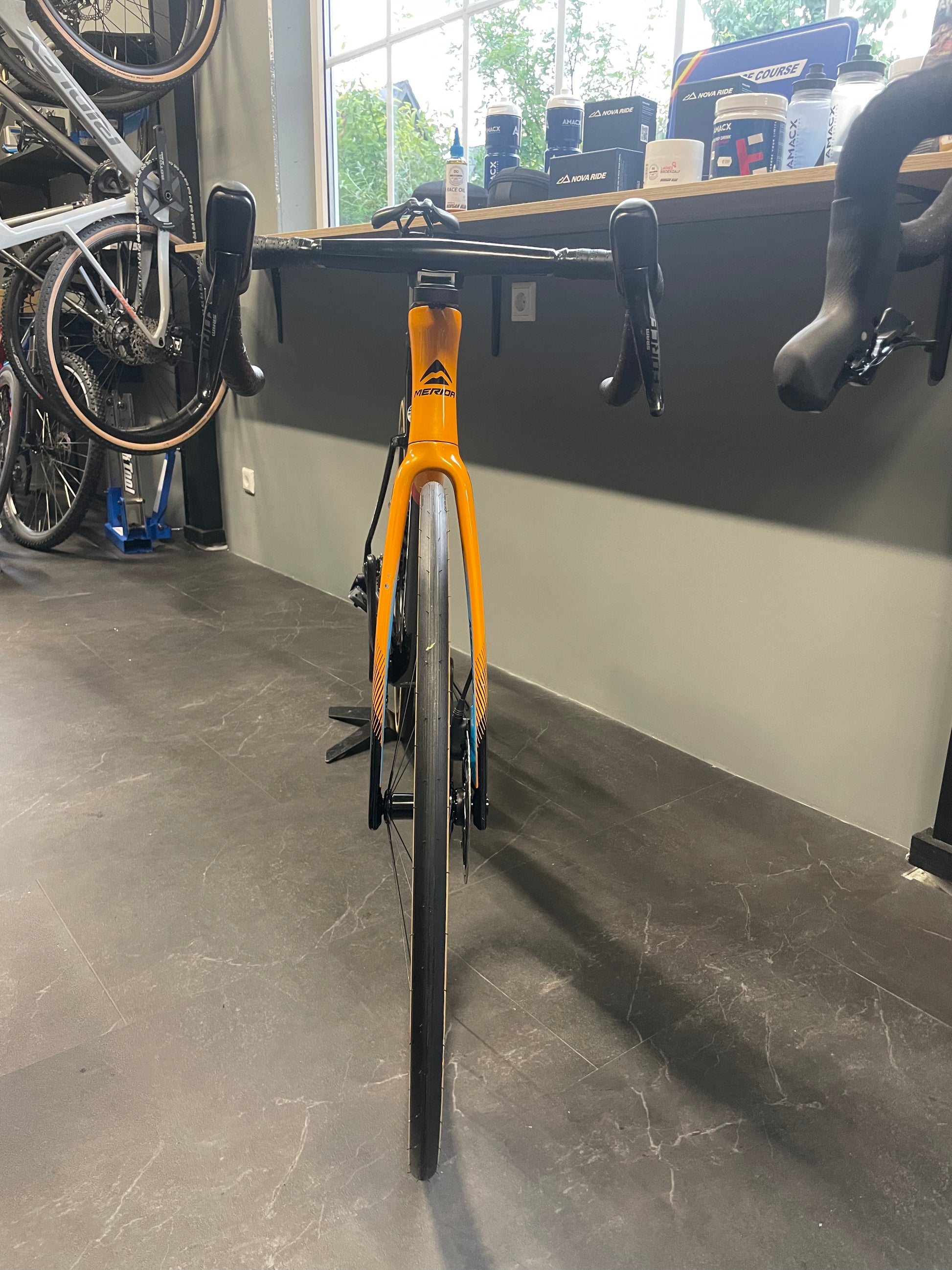 Take your performance to the next level with this pre-owned Merida Reacto 500, a top tier aero road bike built for speed, precision, and aggressive riding. Finished in a striking black, orange, and red color scheme, this bike looks as fast as it rides.