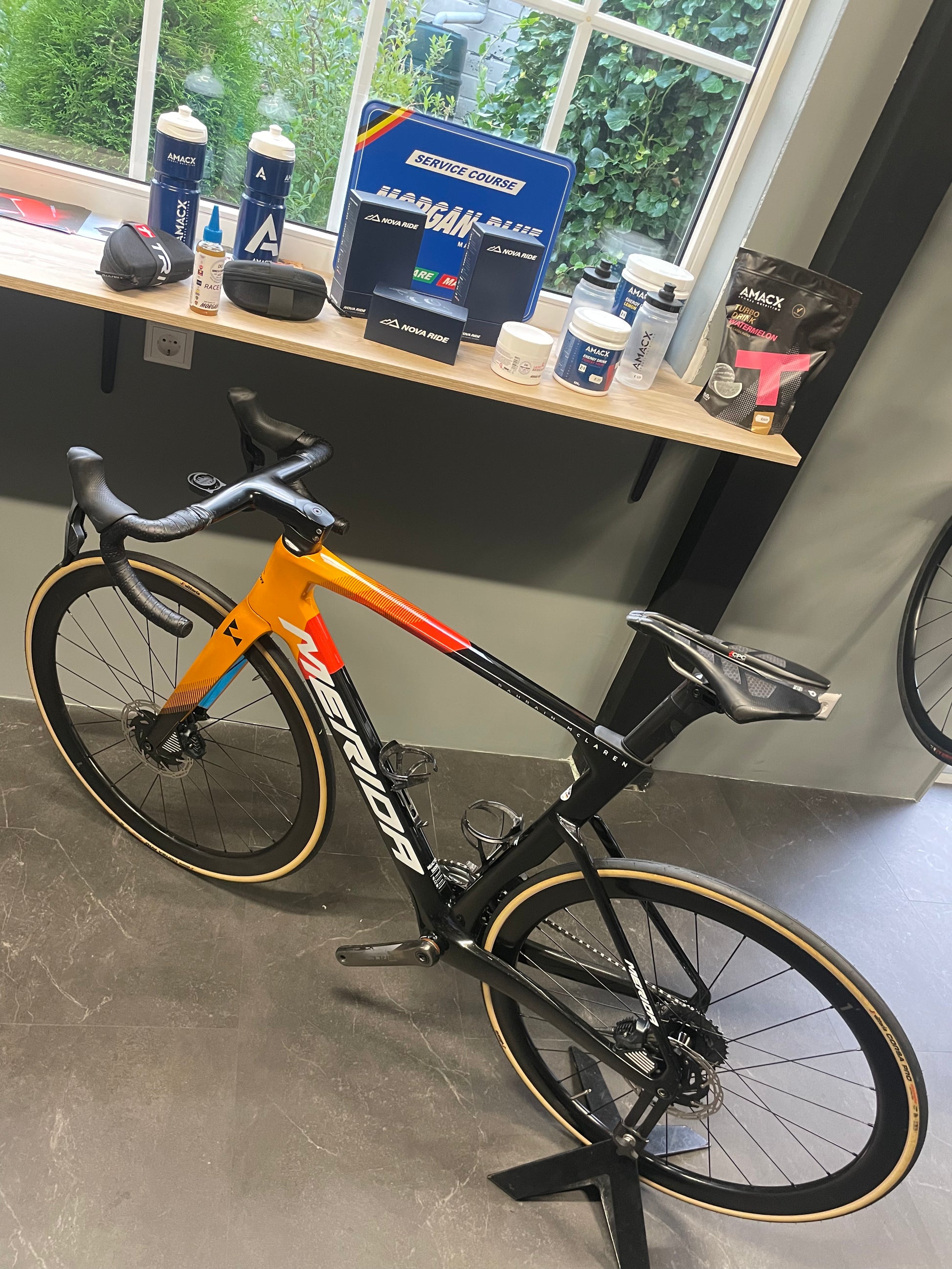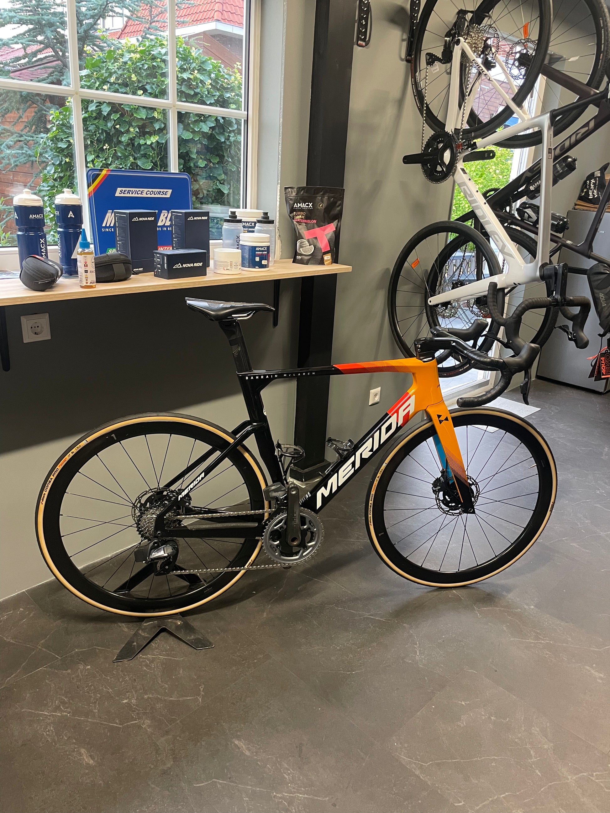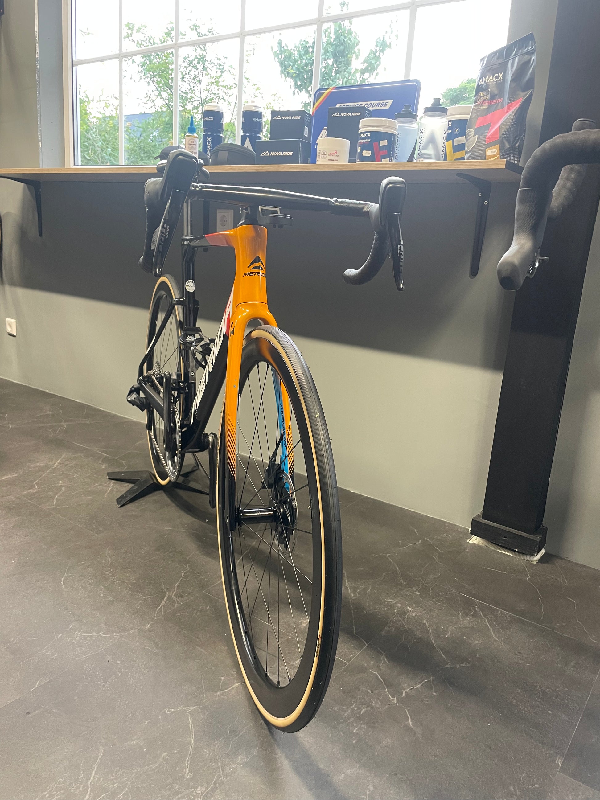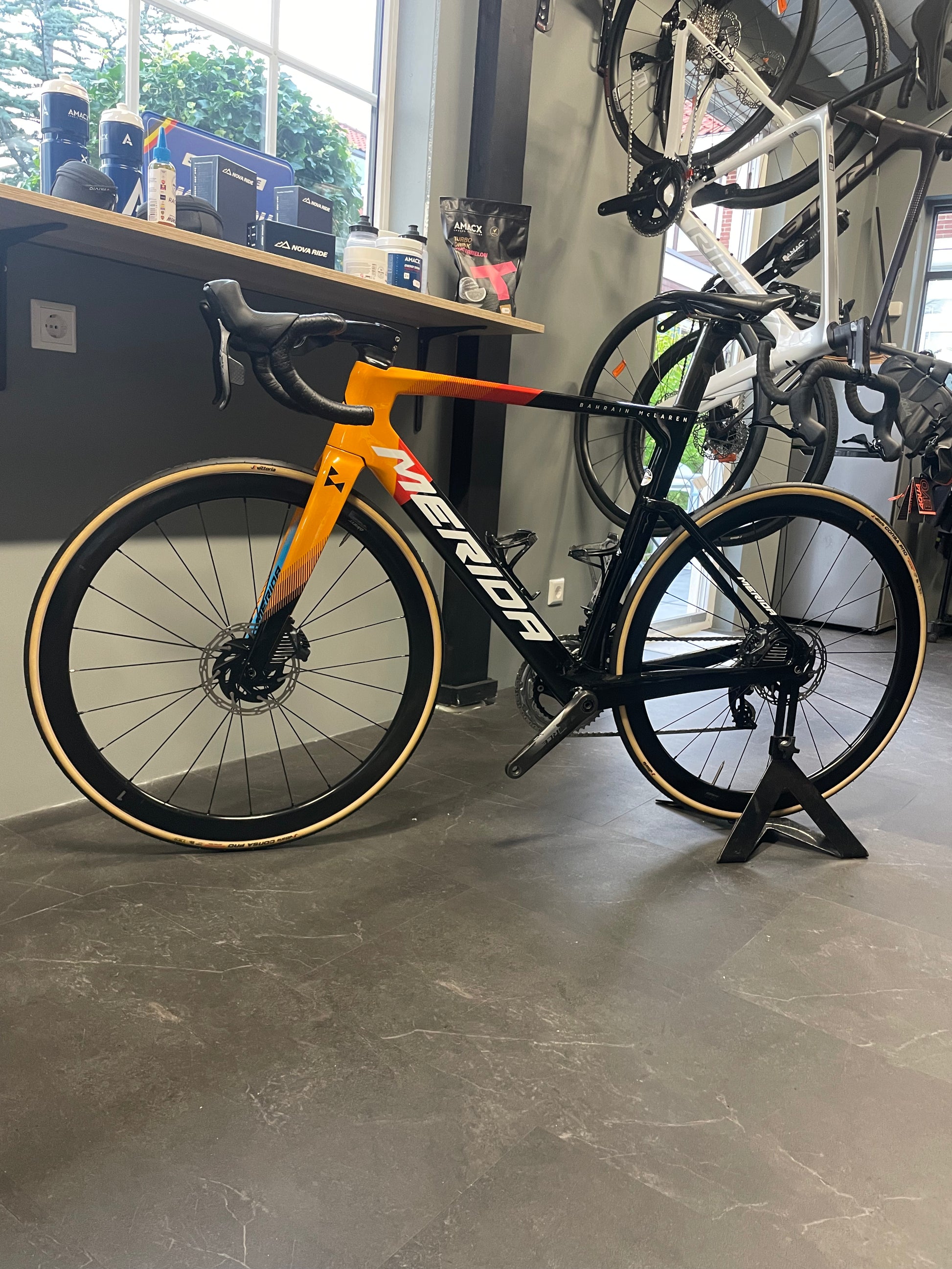 Take your performance to the next level with this pre-owned Merida Reacto 500, a top tier aero road bike built for speed, precision, and aggressive riding. Finished in a striking black, orange, and red color scheme, this bike looks as fast as it rides.